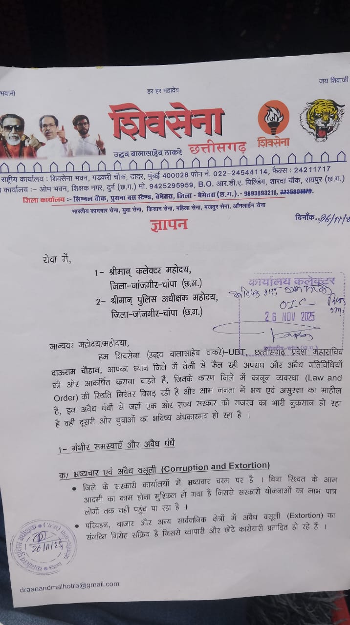 जांजगीर-चांपा, 26 नवम्बर 2025।जिले में तेजी से बढ़ रहे अपराध, अवैध कारोबार और प्रशासनिक अव्यवस्था को लेकर शिवसेना (UBT) छत्तीसगढ़ प्रदेश महाशिविर ने कलेक्टर एवं पुलिस अधीक्षक को एक विस्तृत ज्ञापन सौंप...