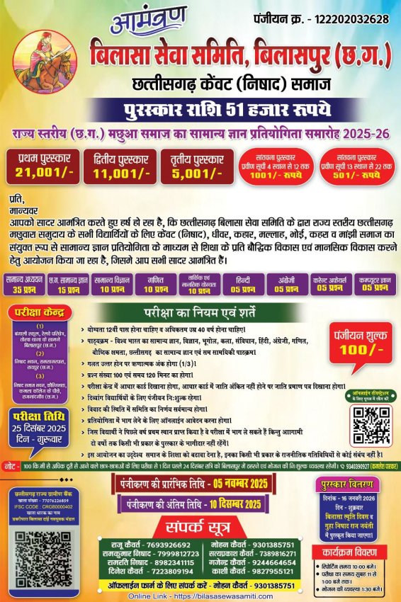 पंजीयन 10 दिसम्बर तक।एक कदम शिक्षा को समर्पित,अत्यन्त हर्ष के साथ,बिलासा सेवा समिति जो शिक्षा को समर्पित है जिसके द्वारा निरन्तर 6 वे वर्ष प्रति वर्ष की भांति इस वर्ष भी लगातार प्रतियोगिता आयोजित कर रहे हैं। इस वर्ष विश...