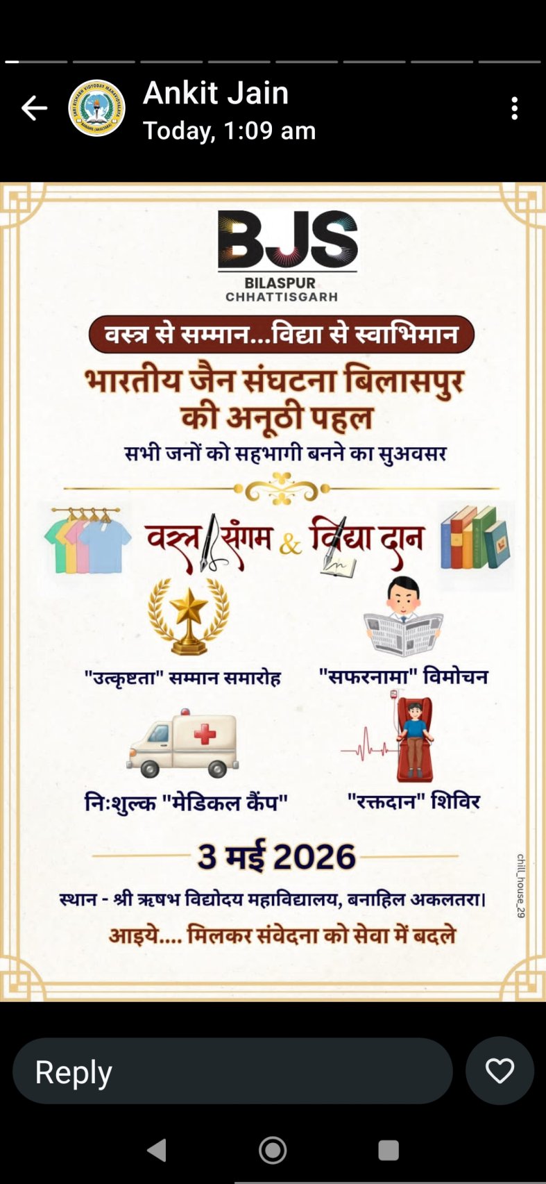 बिलासपुर/अकलतरा। सामाजिक एकता, सेवा और मानवता के संदेश को आगे बढ़ाते हुए भारतीय जैन संगठन (BJS) बिलासपुर द्वारा 3 मई 2026 को एक भव्य सामाजिक आयोजन किया जा रहा है। “वस्त्र से सम्मान… विद्या से स्वाभिमा...