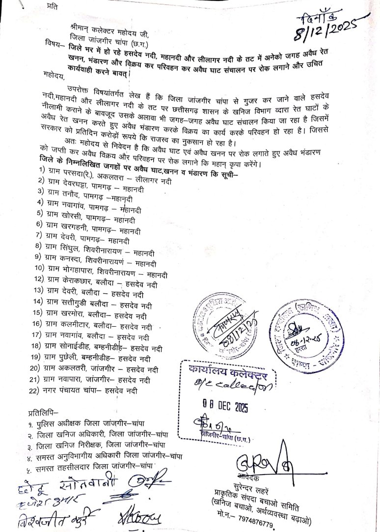जांजगीर–चांपा। जिले में हसदेव, महानदी और लीलागर नदी के तटों पर लगातार बढ़ रहे अवैध रेत उत्खनन को रोकने की मांग को लेकर प्राकृतिक संसाधन बचाव समिति (वनांचल क्षेत्र, अड़भार सहित) ने कलेक्टर जांजगीर–चांपा को एक महत्वपूर्ण ज्ञापन सौंपा। समिति ने अवैध खनन, परिवहन और अवैध घाट संचालन पर रोक लगाने के साथ-साथ दोषियों के विरुद्ध सख्त कार्रवाई की मांग की है।