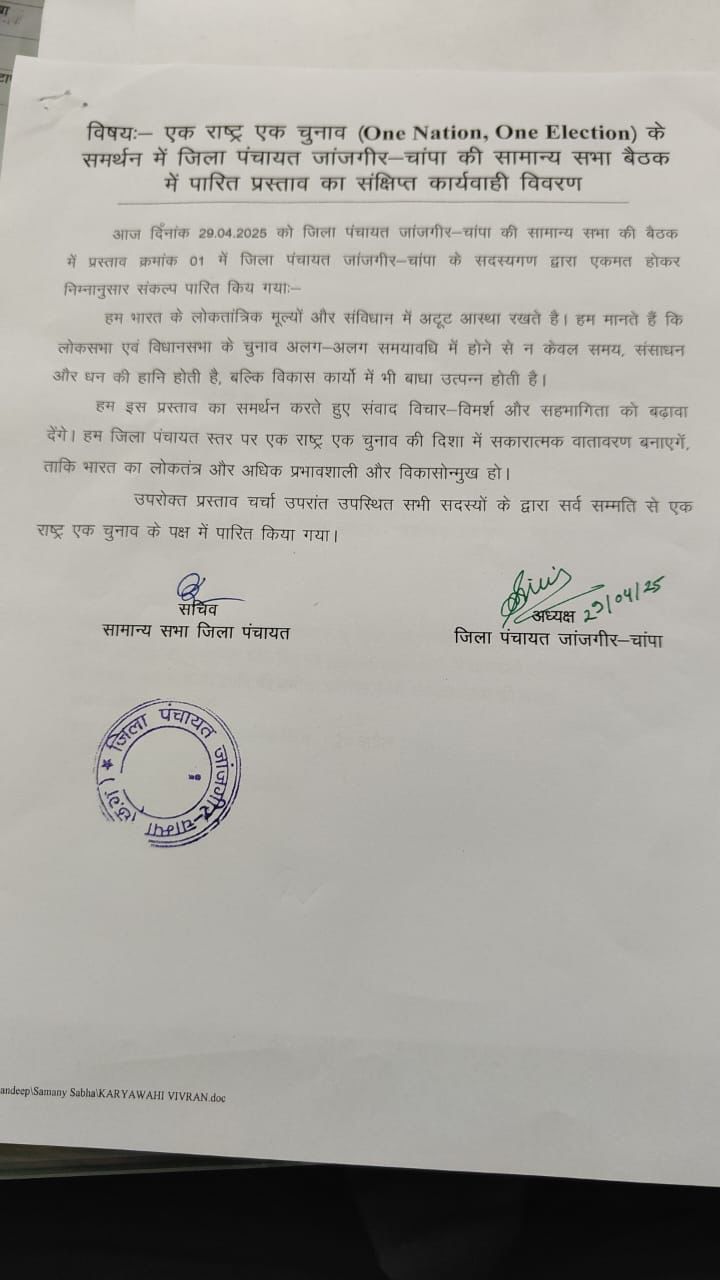 जिला पंचायत जांजगीर चांपा के समान्य सभा में वन नेसन वन इलेक्शन का प्रस्ताव पारित