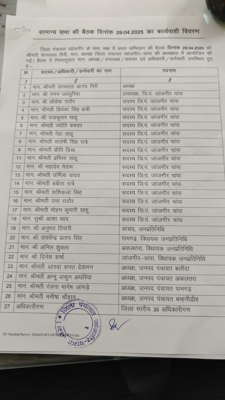 जाँजगीर चांपा के जिला पंचायत सभागार में सामान्य सभा की बैठक इंजी. सत्यलता आनंद मिरी की अध्यक्षता में हुई जिसमे सर्वसम्मति से एक राष्ट्र एक चुनाव का अहम प्रस्ताव पारित हुआ।