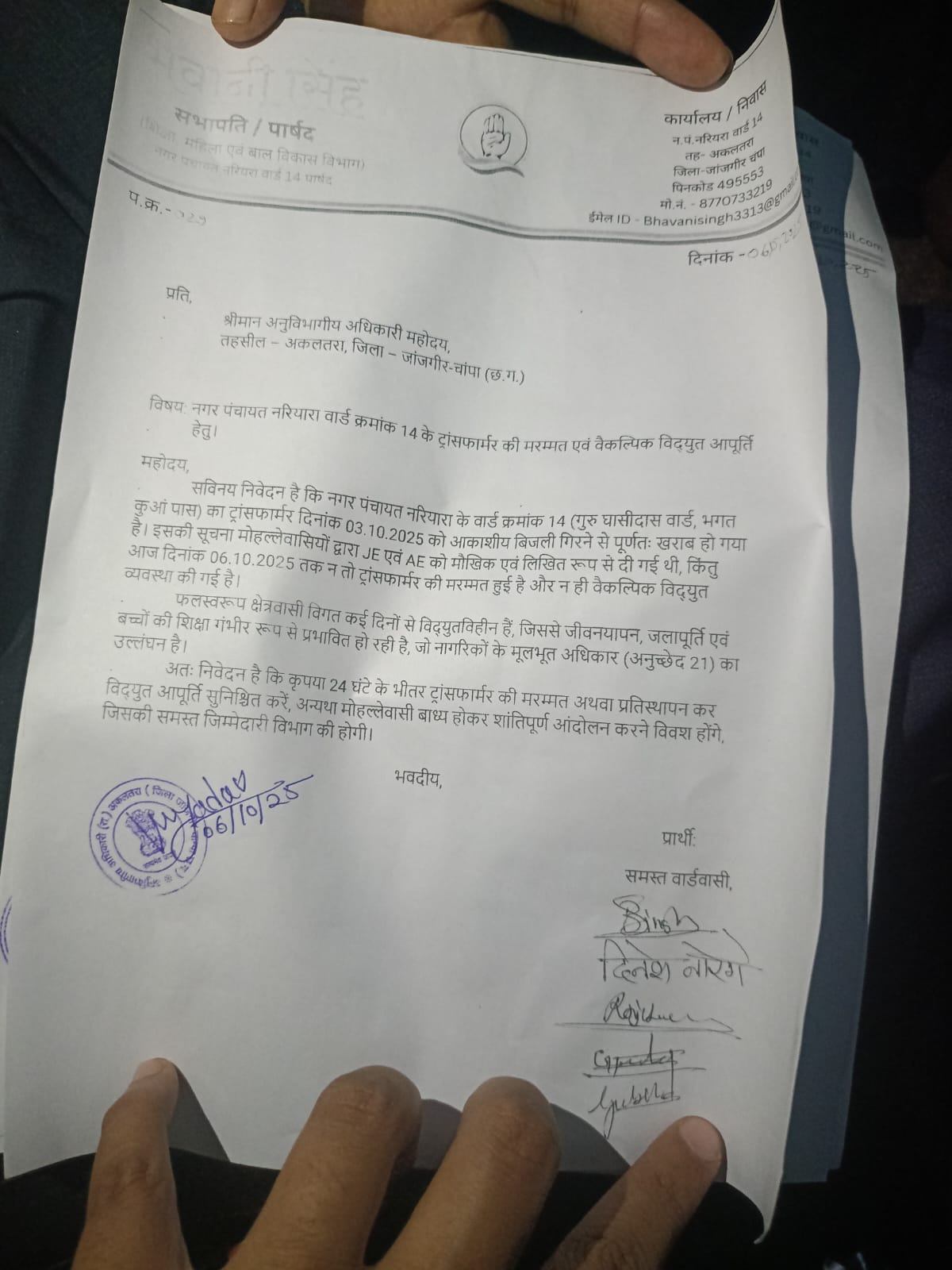 नगर की सभापति / पार्षद श्री भवानी सिंह ने इस संबंध में विद्युत वितरण विभाग के कार्यपालक अभियंता तथा अनुविभागीय अधिकारी को पत्र लिखकर ट्रांसफार्मर की शीघ्र मरम्मत एवं वैकल्पिक विद्युत आपूर्ति की मांग की है। उन्होंने पत्र में बताया कि स्थानीय JE और AE को खराब ट्रांसफार्मर की जानकारी पहले ही दी जा चुकी है, लेकिन 6 अक्टूबर तक भी कोई सुधार कार्य प्रारंभ नहीं हुआ। कार्यालय जाने पर विभाग के अधिकारी और कर्मचारी अनुपस्थित रहते है और पावती देने से भी कतराते है ।