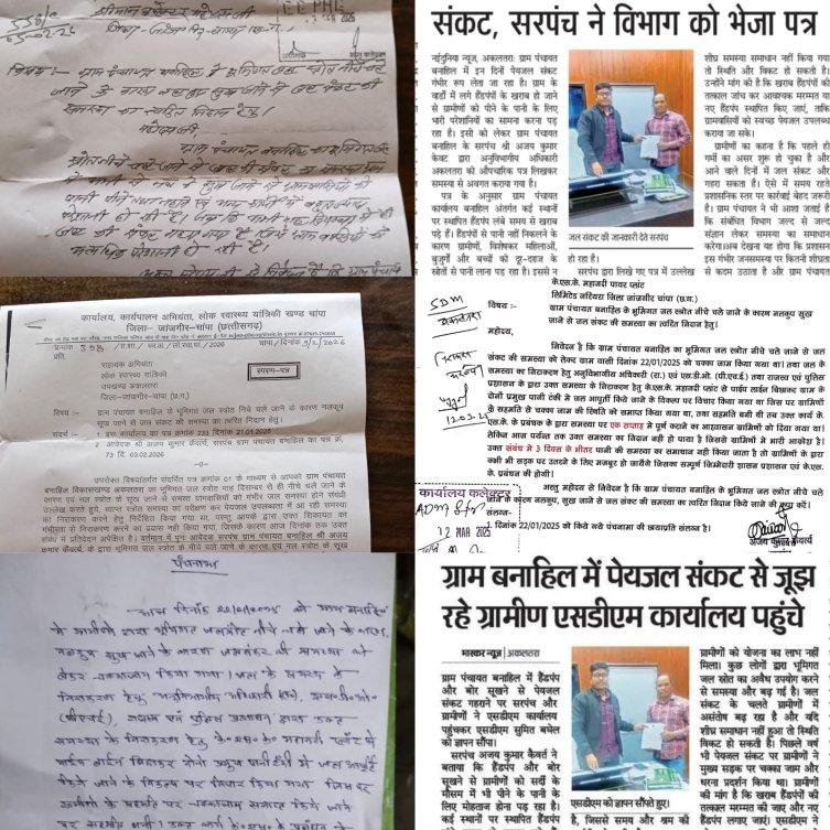 जांजगीर-चांपा। जिले के अकलतरा क्षेत्र अंतर्गत ग्राम पंचायत बनाहिल में पीने के पानी की समस्या दिनों-दिन गंभीर होती जा रही है। गांव के कई मोहल्लों में लोगों को रोजाना पानी के लिए जद्दोजहद करनी पड़ रही है, लेकिन जिम्मेदार अधिकारी और पंचायत प्रतिनिधि समस्या के स्थायी समाधान के बजाय केवल कागजी औपचारिकताएं पूरी करते नजर आ रहे हैं।