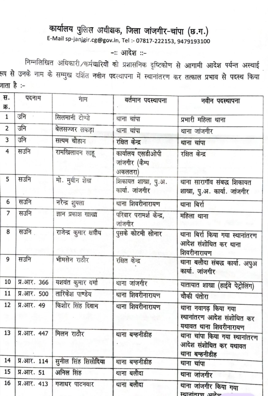 स्थानांतरण आदेश के बावजूद शिवरीनारायण थाना से मोह नहीं छोड़ रहे प्रधान आरक्षक तरीकेश पांडे
