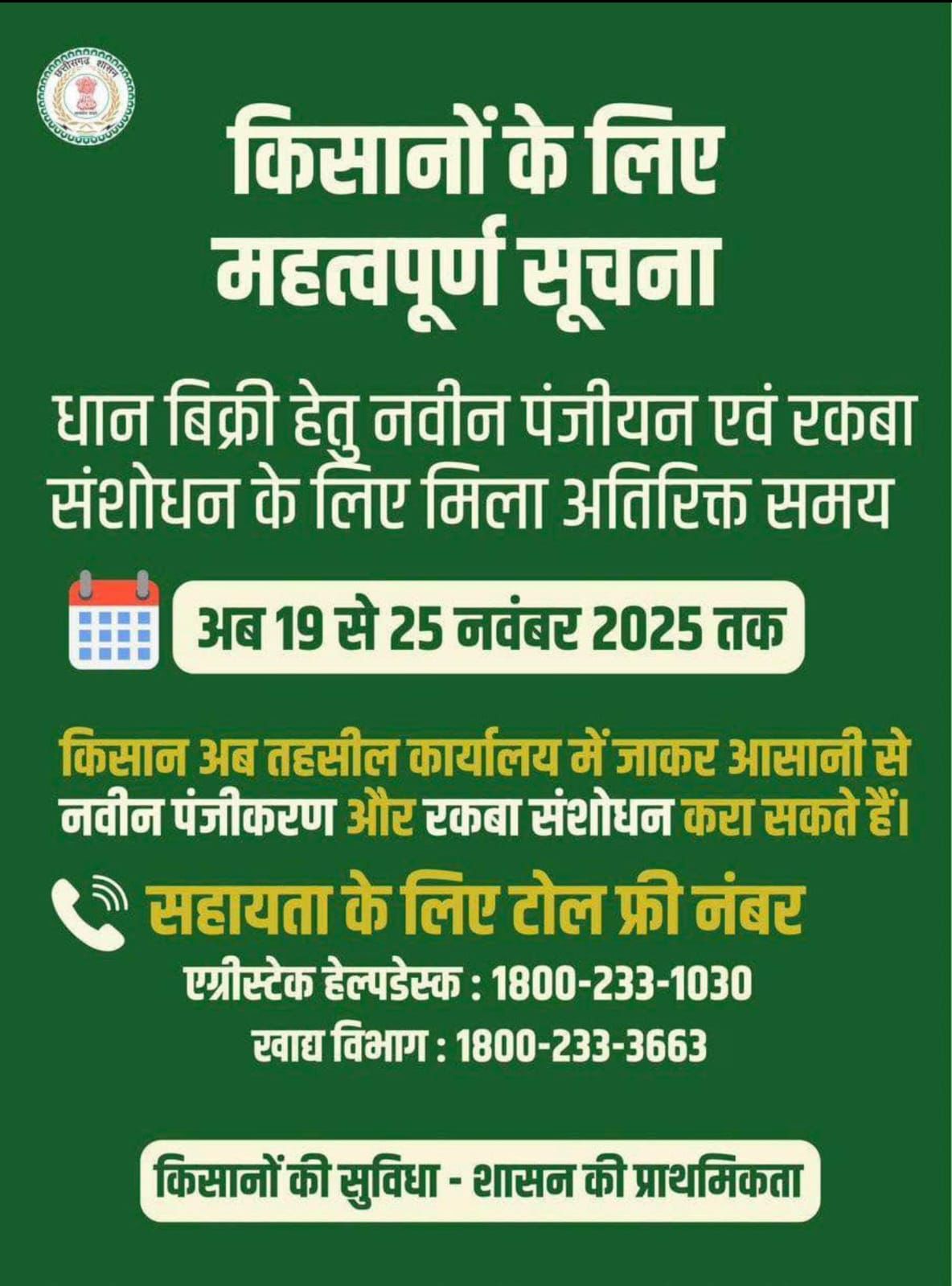 धान विक्रय हेतु नवीन पंजीयन व रकबा संशोधन के लिए 19 से 25 नवंबर तक अतिरिक्त समय