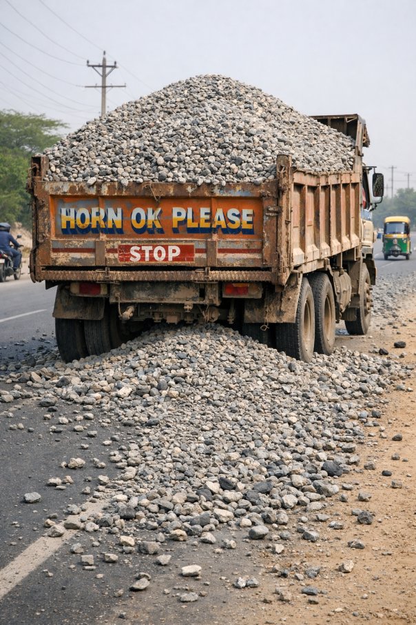 अकलतरा क्षेत्र में ओवरलोड गिट्टी से लदे भारी वाहनों (हाइवा) से सड़क पर हो रहे बेतरतीब बिखराव