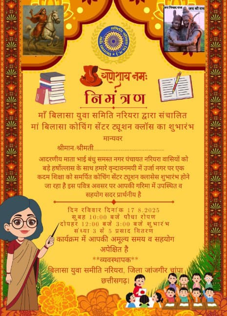 एक कदम शिक्षा को समर्पित बिलासा युवा समिति नरियरा जिला जांजगीर चांपा छत्तीसगढ़ द्वारा नगर पंचायत नरियरा में बिलासा कोचिंग सेंटर ट्यूशन क्लॉस नर्सरी से 12 वीं तक सभी विषय CBSE CG बोर्ड कक्षाएं सभी विद्यार्थियों के लिए शुभारंभ किया गया।
