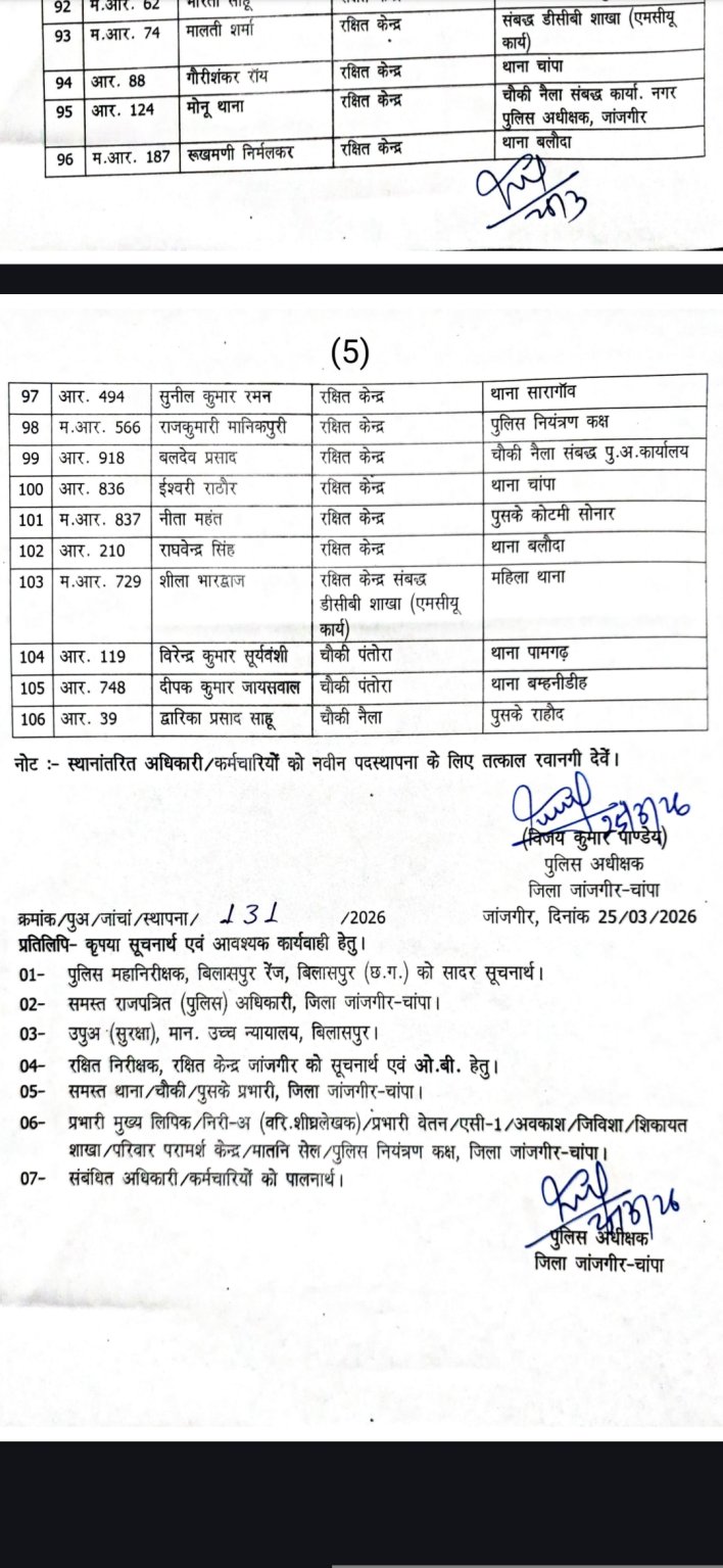 जांजगीर-चांपा। जिले में कानून-व्यवस्था को और अधिक सुदृढ़ एवं प्रभावी बनाने की दिशा में पुलिस विभाग ने बड़ा प्रशासनिक निर्णय लेते हुए व्यापक स्तर पर तबादले किए हैं। पुलिस अधीक्षक विजय कुमार पाण्डेय के निर्देश पर कुल 106 पुलिस अधिकारी एवं कर्मचारियों को एक स्थान से दूसरे स्थान पर पदस्थ किया गया है।