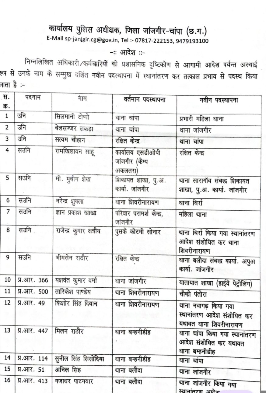 जानकारी के अनुसार, जिले के पुलिस अधीक्षक विजय कुमार पांडेय द्वारा विभागीय कसावट और प्रशासनिक सुधार के उद्देश्य से व्यापक स्तर पर तबादला आदेश जारी किया गया। इसी क्रम में शिवरीनारायण थाने में भी बदलाव किया गया है। इस निर्णय को पुलिस विभाग में पारदर्शिता और जवाबदेही बढ़ाने की दिशा में महत्वपूर्ण कदम माना जा रहा है।